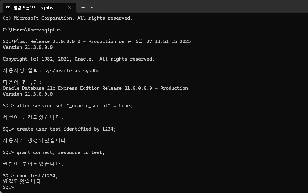 7. '권한이 부여되었습니다' 라고 뜨면 sql> 프롬프트에 conn test/1234; 를 입력하고 엔터
