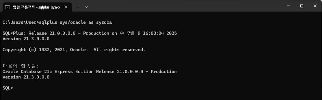 '명령 프롬프트' 화면에서 다음 명령어를 입력하여 오라클 데이터베이스 관리 계정으로 접속합니다.