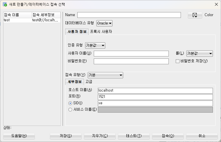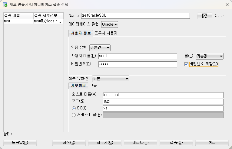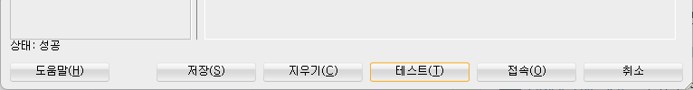 접속정보를 모두 입력하셨다면 하단 버튼 중 [테스트(T)]를 클릭합니다.