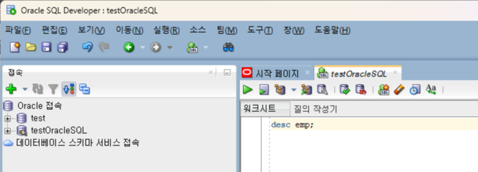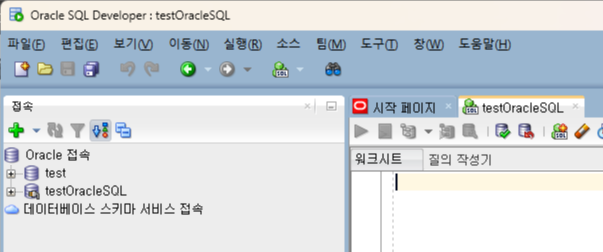 왼쪽에 'testOracleSQL'이 보여지면 정상적으로 접속된 것입니다.