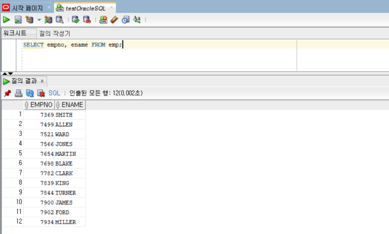 위 예제는 emp 테이블에 전체 데이터 중에서 mpno, ename 두개의 열만 조회하는 경우로 예제의 실행결과는 아래와 같습니다.