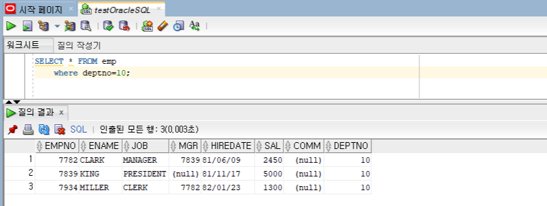 위 예제는 emp 테이블에 전체 데이터 중에서 ' deptno=10' 행만 조회하는 경우로 예제의 실행결과는 아래와 같습니다.