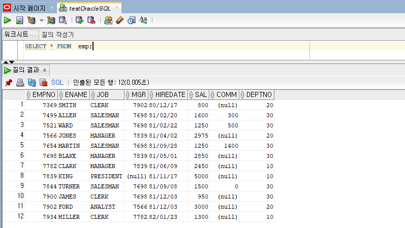 위 예제는 emp 테이블에 전체 데이터를 조회하는 예제로 실행결과는 아래와 같습니다.