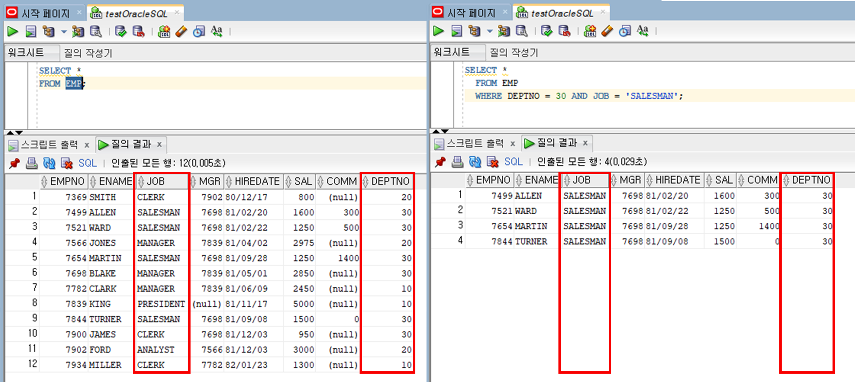 AND 연산자는 여러개의 조건을 동시에 만족할 때 사용합니다. 예제로 EMP 테이블에서 부서번호(DEPTNO)가 30인 직원중 직업(JOB)이 'SALESMAN'인 자료만 출력하는 QURY를 작성하면 아래와 같습니다.