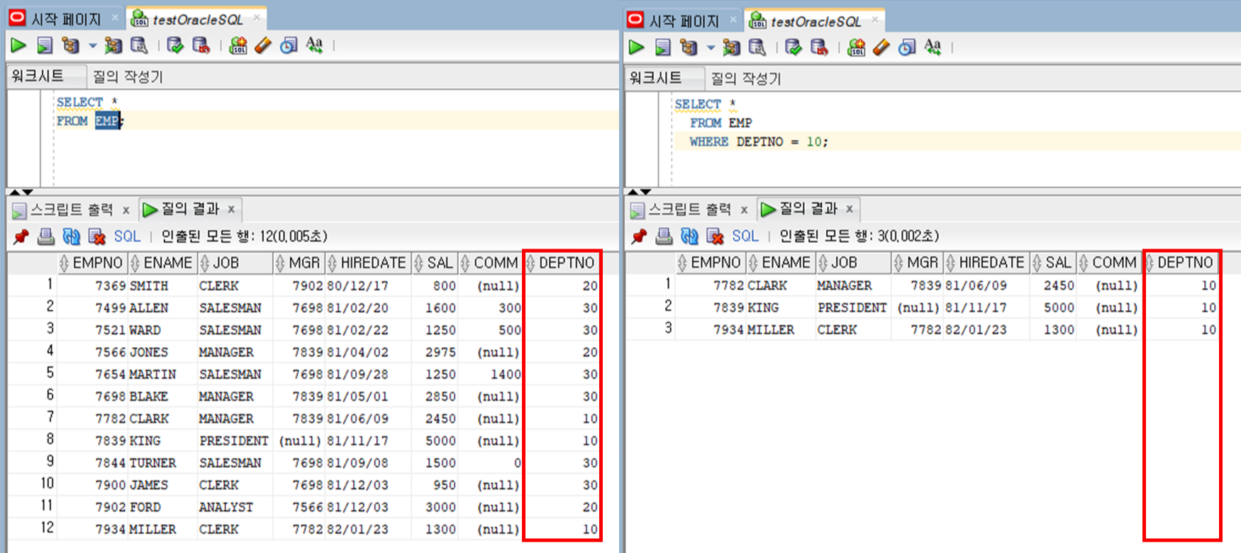 WHERE 이하 조건식에서 ' DEPTNO = 10' 인 조건에 만족하는(결과가 참인, 결과 값이 TRUE인) 데이터만 출력합니다.