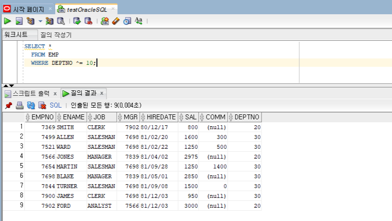 DEPTNO ^= 10 이외에 DEPTNO <> 10나 DEPTNO != 10로 조회 하셔도 결과는 아래와 같습니다.