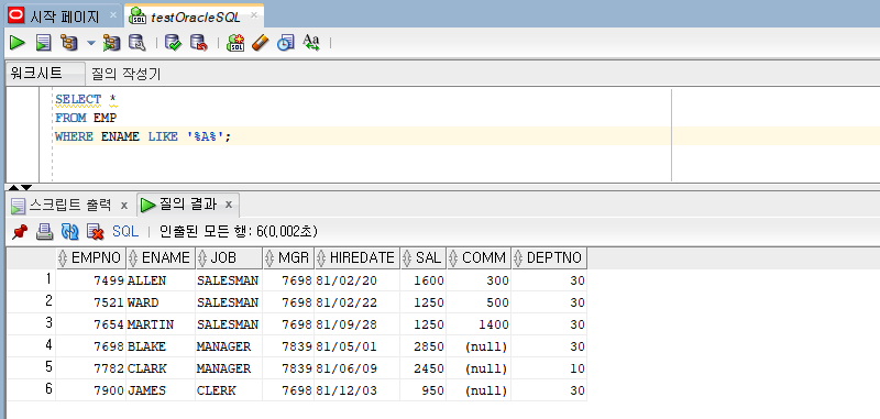 두개의 와일드 카드를 모두 이용해서 데이터를 찾을 수도 있습니다. 예를 들어 이름(ENAME)의 두번째 알파벳이 'A'인 사원 데이터를 출력 하고 싶은 경우 아래와 같이 조회 하시면 됩니다.