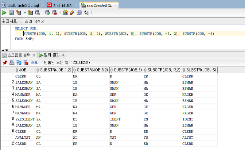 - SUBSTR(JOB, 3, 2) : 문자열의 처음에서 세 번째 글자부터 두 글자를 출력합니다.