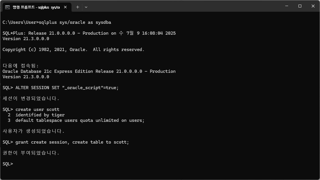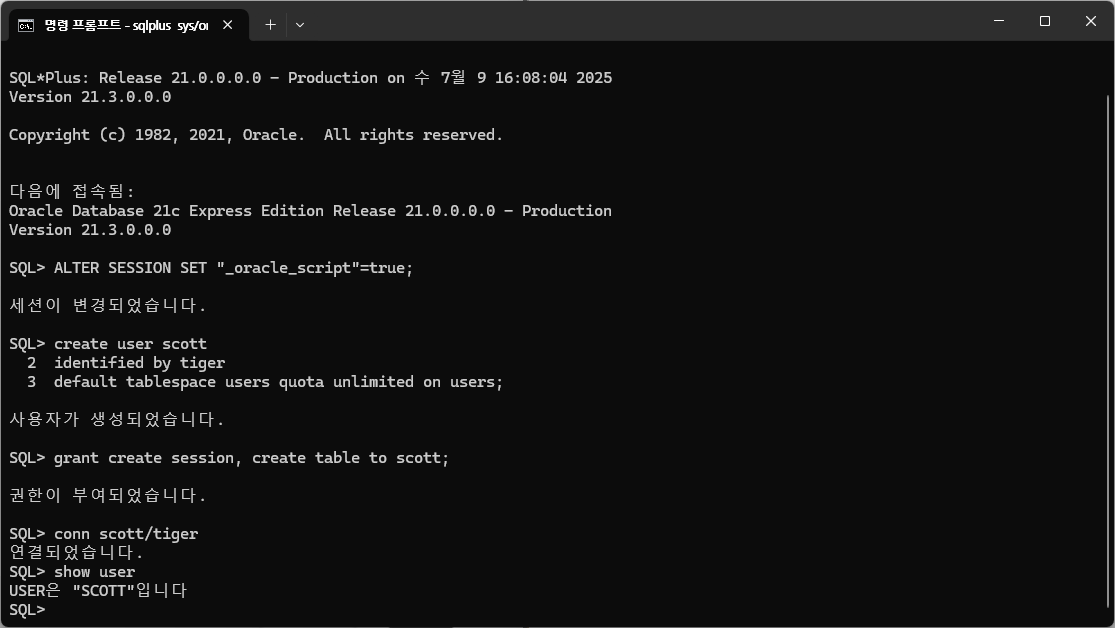 Oracle Database에 접속하여 SCOTT 계정 설정하기