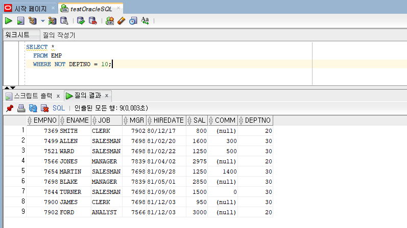 이번에는 반대의 경우를 생각해 봅시다. 급여(SAL)가 2,000 ~ 3,000 사이 외인 사원 데이터를 출력 하고 싶을 때는 어떻게 하면 될까요? 아래와 같이 조회 하시면 됩니다.